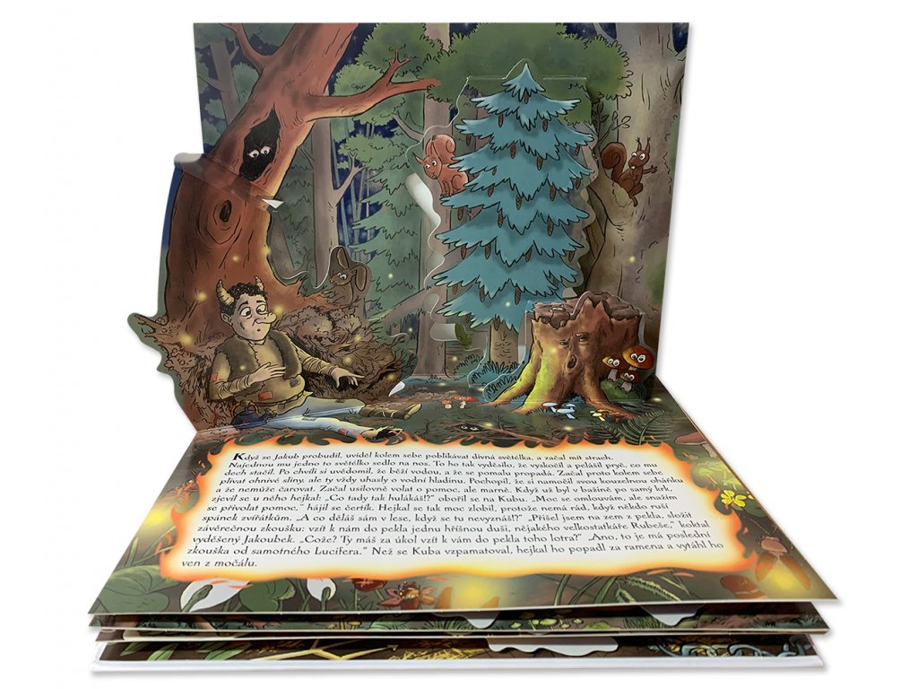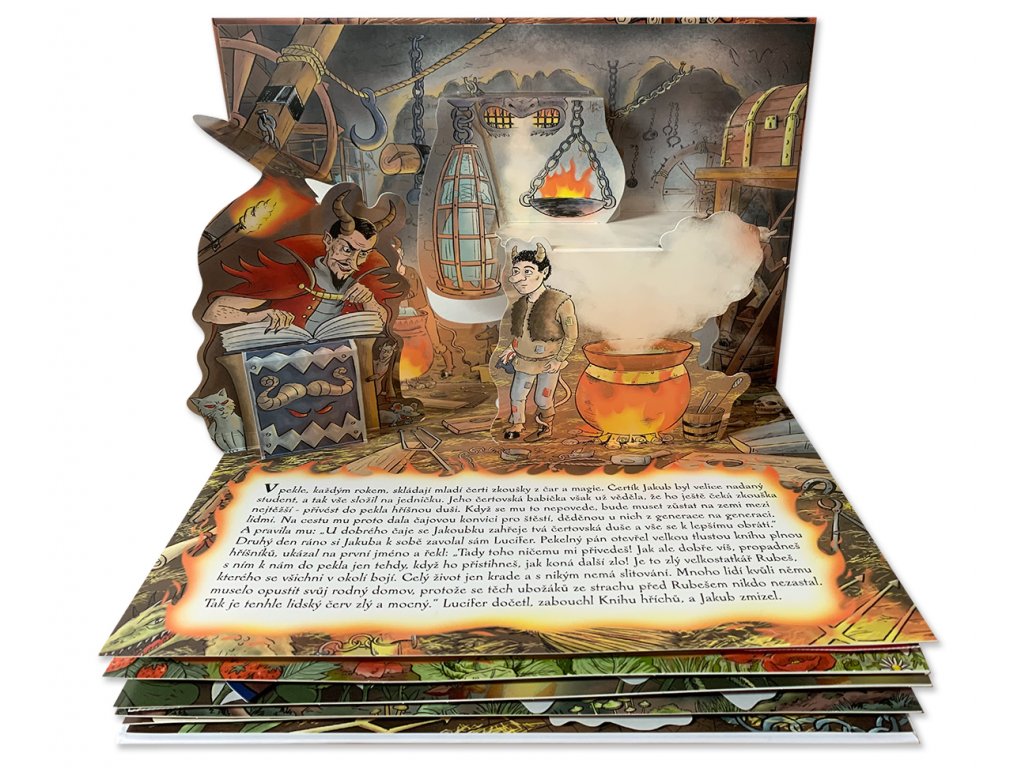 Krásně ilustrovaná 3D pop-up prostorová knížka ve stylu díla Vojtěcha Kubašty, která vypráví o čertím mladíkovi Jakubovi a jeho dobrodružstvích při plnění pekelné maturity.