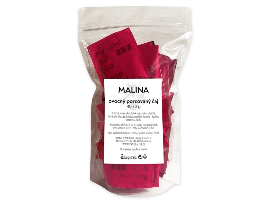 Ovocný čaj s příjemnou chutí a vůní maliny v nálevovém sáčku s nitkou a visačkou v balení po 40 nebo 100 kusech.
