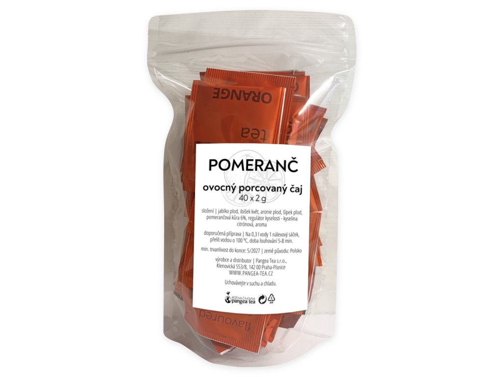 Ovocný čaj se svěží příchutí pomeranče v nálevovém sáčku s nitkou a visačkou v polypropylenovém přebalu pro uchování aroma a čerstvosti.