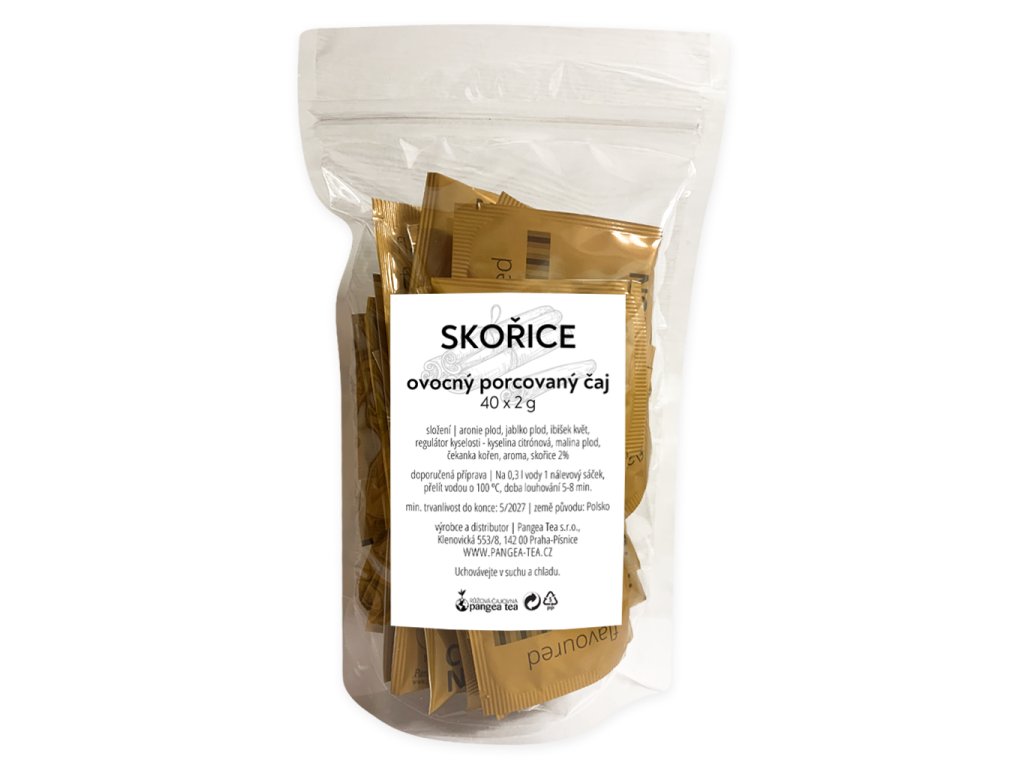 Ovocný čaj s jemnou příchutí skořice v nálevovém sáčku s nitkou a visačkou v balení po 40 nebo 100 kusech.